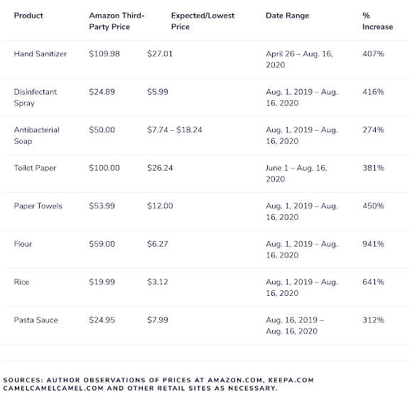 This took place at a time when many bricks and mortar stores throughout the United States had been ordered shuttered as a result of the pandemic. With stay-at-home orders issued by state-level governments, many American consumers turned to shopping online for goods they needed during the pandemic. Below are some examples of price gouging by third-party sellers on items that were considered necessities for consumers:
