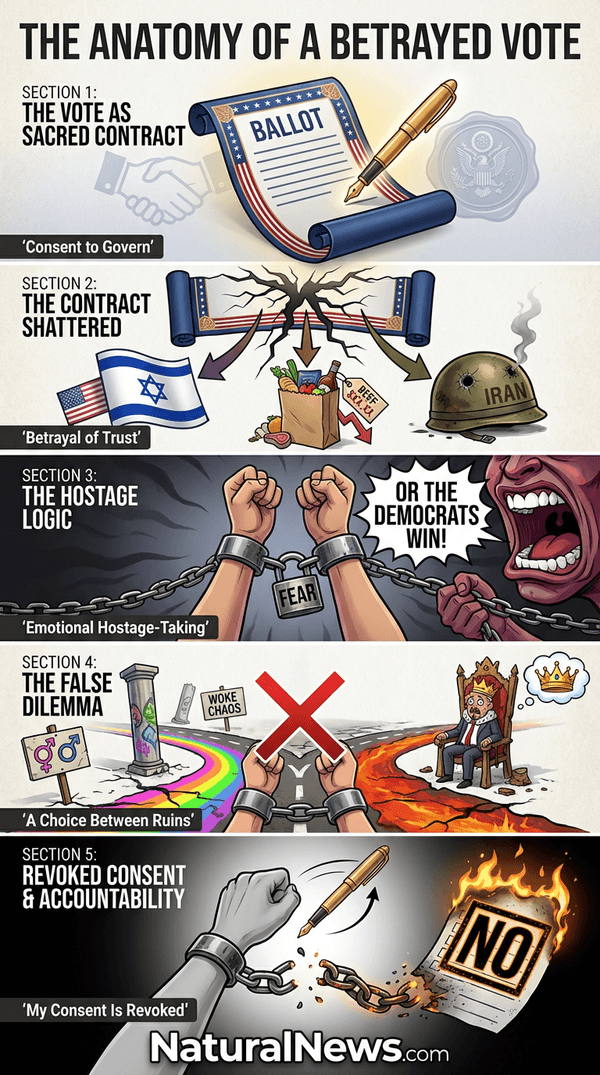 This is not values-driven politics. This is emotional hostage-taking, a corrupt attempt to weaponize our reasonable dread of the left’s destructive agenda to justify our own team’s treachery. I am told I must consent to my own betrayal to avoid a greater evil. I refuse. My vote is not a hostage to be bartered. It is a sacred instrument of accountability, and I will not wield it to endorse my own subjugation. The movement that promised to be a coalition of patriots has devolved into an obedience cult of mindless idiots demanding loyalty even as it marches in the opposite direction of its founding principles. [2]