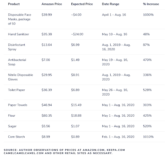 This took place at a time when many bricks and mortar stores throughout the United States had been ordered shuttered as a result of the pandemic. With stay-at-home orders issued by state-level governments, many American consumers turned to shopping online for goods they needed during the pandemic. Below are some examples of price gouging by third-party sellers on items that were considered necessities for consumers: