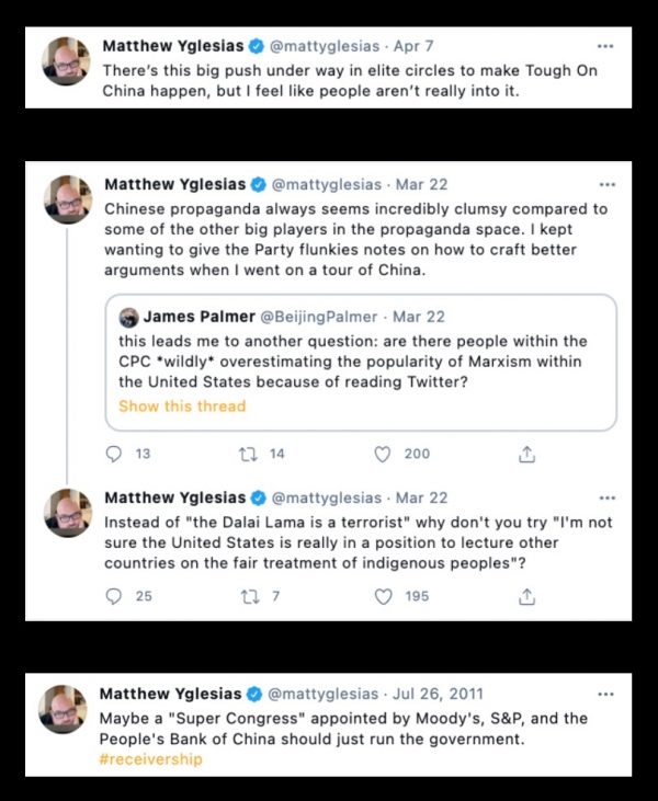 Ezra Klein appeared to laud the Chinese Communist Party’s COVID-19 response, tweeting “I keep hearing that China bought us some real time and our government wasted it doing nothing and downplaying the threat.” Fellow Vox Co-founder Matthew Yglesias also tweeted about wanting to “give Party flunkies notes” on how to better craft “propaganda” and that “Moody’s, S&P, and the People’s Bank of China should just run the government”: