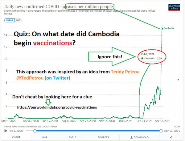 “The following show data from around the world from some selected locations. It is, of course, vital to stress that correlation is not causation. And that there are countries where vaccine rollout does not precede or coincide with increased infections. However, I have been unable to find any nation where covid rates have begun to drop after vaccination started, or where a drop coincided with vaccination starting. In Indonesia, for example, the covid rate was falling when vaccination started and seems to have been unaffected in its trajectory by the vaccine being rolled out. The reader can look up these charts for him/herself on the website. Have a look at these and see what you make of them.” (“Covid rates post-vaccination around the world“, Inform Scotland)