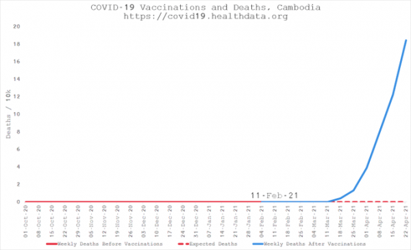 The sharp rise in cases and deaths following mass vaccination is NOT related to Covid “the respiratory illness”, but Covid “the vascular disease”. The vascular component is mainly the result of spike proteins produced by cells in the lining of the blood vessels (Endothilium) that are activating platelets that cause blood clots and bleeding. The other main factor is autoimmune reaction in which the killer lymphocytes attack one’s own body triggering widespread inflammation (and potential organ failure.). In short, the post-injection fatalities are caused by the spike proteins produced by the vaccines and not by Covid. Once again, look at the chart of Cambodia. There were no deaths prior to vaccination. All the deaths came afterwards. That suggests that the fatalities are attributable to the vaccines.