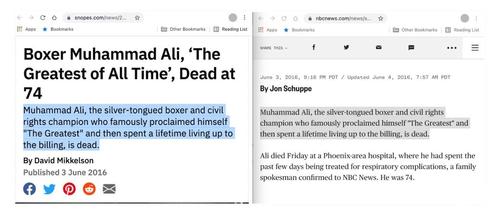 In one Slack message from January 2016, Mikkelson detailed his strategy for copying and then quickly rewriting articles after publishing. “Usually when a hot real news story breaks (such as a celebrity death), I just find a wire service or other news story about it and publish it on the site verbatim to quickly get a page up. Once that’s done, then I quickly start editing the page to reword it and add material from other sources to make it not plagiarized,” he wrote.